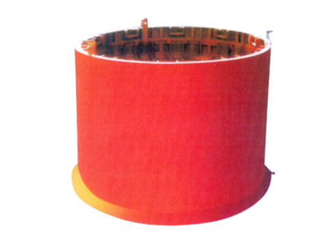 井整體移動(dòng)金屬模板主體結(jié)構(gòu)為多塊圓弧形金屬板塊連接形成單縫式環(huán)形結(jié)構(gòu),并由數(shù)層圓環(huán)連成只有一個(gè)收縮口的剛性模板。模板支脫模動(dòng)作通過(guò)氣動(dòng)液壓泵驅(qū)動(dòng)一組伸縮液壓缸,并通過(guò)手動(dòng)液壓閥實(shí)現(xiàn)的。安裝在主體模板下端的下刃腳,能防治混凝土跑漿,實(shí)現(xiàn)了下行砌壁方式。該模板具有剛性大整體強(qiáng)度高,多次拆裝后變形量小的特點(diǎn),液壓收縮機(jī)構(gòu)能夠靈活的進(jìn)行脫模、立模。因而,在煤礦和金屬礦山井筒砌壁時(shí)被廣泛使用。